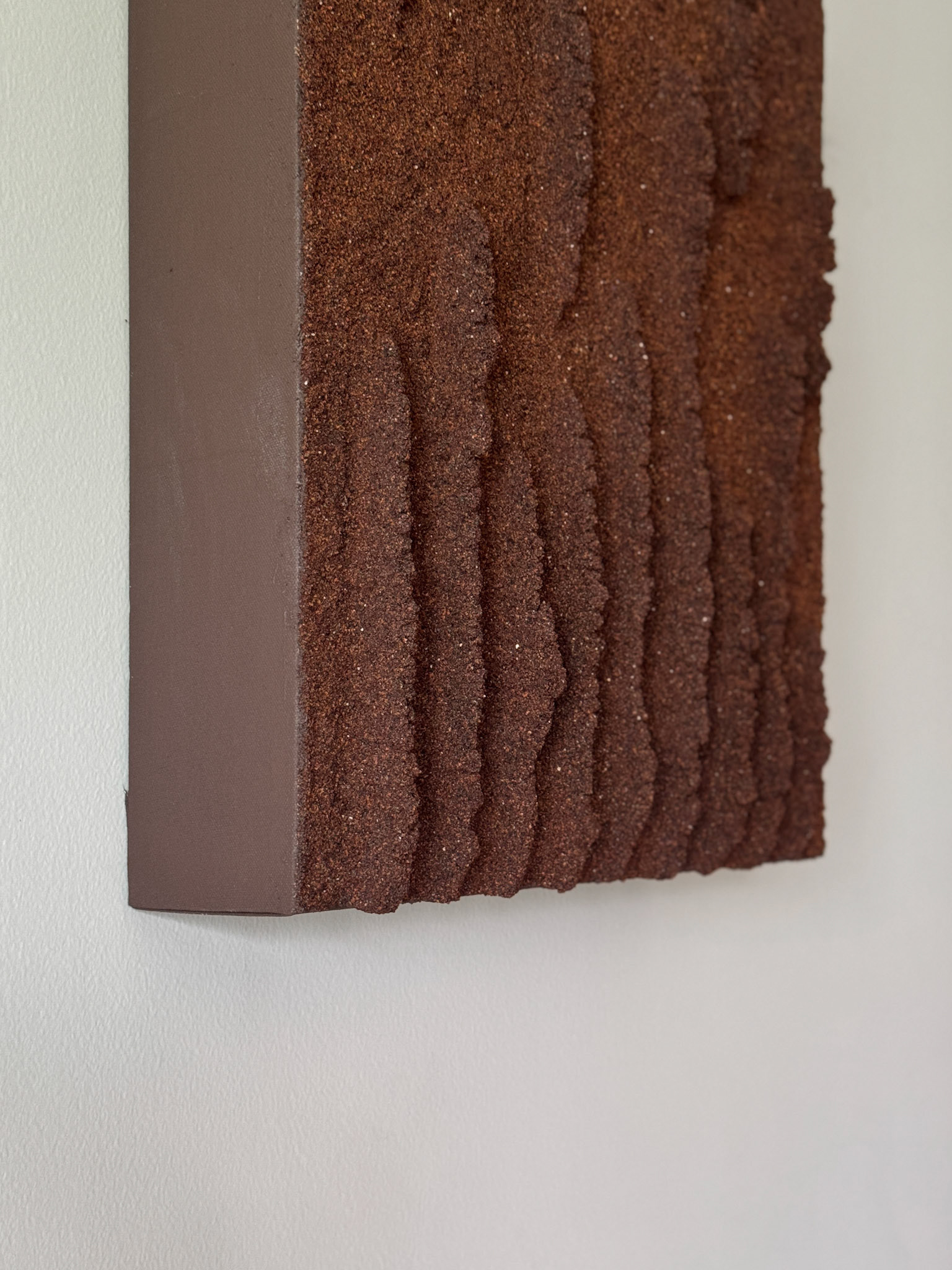 This series uses powdered tezontle to create works that bring three-dimensionality to a two-dimensional work of art. Tezontle is a volcanic rock with a unique texture and color. Tejedo uses this material to create abstract forms that evoke beauty and nature. Within this series, the artist also uses other natural materials, such as tepetate and red clay, to create works that transport the viewer to another place.